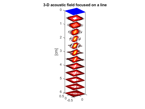 plot3(xe*1e2,ye*1e2,0*xe,'b.') contourslice(x*1e2,y*1e2,z*1e2,RP,[],[],.5:.5:6,15) set(gca,'zdir','reverse') axis equal colormap(hot) zlabel('[cm]') view(-35,20) box on title('3-D acoustic field focused on a line')