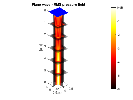 RPdB = 20*log10(RP/max(RP(:))); % convert to dB slice(x*1e2,y*1e2,z*1e2,RPdB,0,0,1:5) shading flat colormap(hot), caxis([-6 0]) set(gca,'zdir','reverse'), axis equal % Fine-tune the figure: alpha color % some transparency c = colorbar; c.YTickLabel{end} = '0 dB'; zlabel('[cm]') title('Plane wave - RMS pressure field') hold on plot3(xe*1e2,ye*1e2,xe*0,'b.') hold off