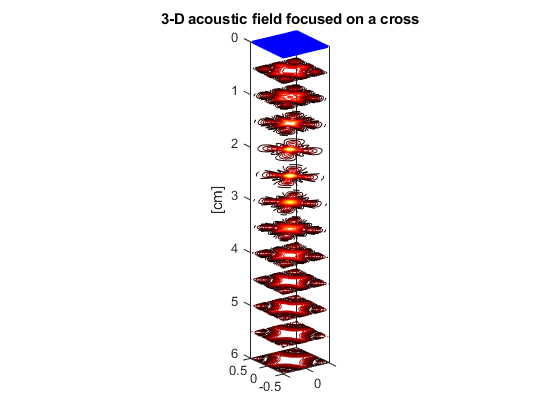plot3(xe*1e2,ye*1e2,0*xe,'b.') contourslice(x*1e2,y*1e2,z*1e2,RP,[],[],.5:.5:6,15) set(gca,'zdir','reverse') % Fine-tune the figure: axis equal colormap(hot) zlabel('[cm]') view(-35,20) box on title('3-D acoustic field focused on a cross')