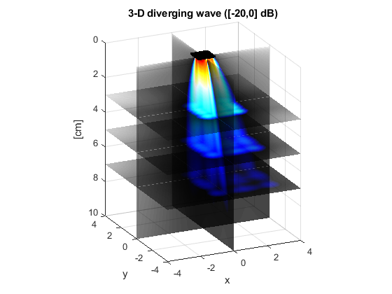 Pmax = max(max(Paz(:)),max(Pel(:))); surf(xaz*1e2,yaz*1e2,zaz*1e2,20*log10(Paz/Pmax)), shading flat hold on surf(xel*1e2,yel*1e2,zel*1e2,20*log10(Pel/Pmax)), shading flat surf(xfo*1e2,yfo*1e2,zfo1*1e2,20*log10(Pfo1/Pmax)), shading flat surf(xfo*1e2,yfo*1e2,zfo2*1e2,20*log10(Pfo2/Pmax)), shading flat surf(xfo*1e2,yfo*1e2,zfo3*1e2,20*log10(Pfo3/Pmax)), shading flat % Display the elements plot3(xe*1e2,ye*1e2,xe*0,'k.') hold off % Fine-tune the figure: axis equal zlabel('[cm]') set(gca,'ZDir','reverse') title('3-D diverging wave ([-20,0] dB)') caxis([-20 0]) alpha color colormap(flipud([hot;1-hot])) xlabel('x') ylabel('y') view(-25,20)